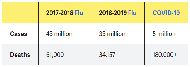 The common flu generally leads to 30,000-40,000 US deaths per year or up to 650,000 globally and has a mortality rate of about 1% or less15. In striking contrast, the mortality rate of COVID-19 is as high as 29% in countries hit hardest and is about 2% in the United States16. The difference in country-specific mortality rates is due to a number of variables17: